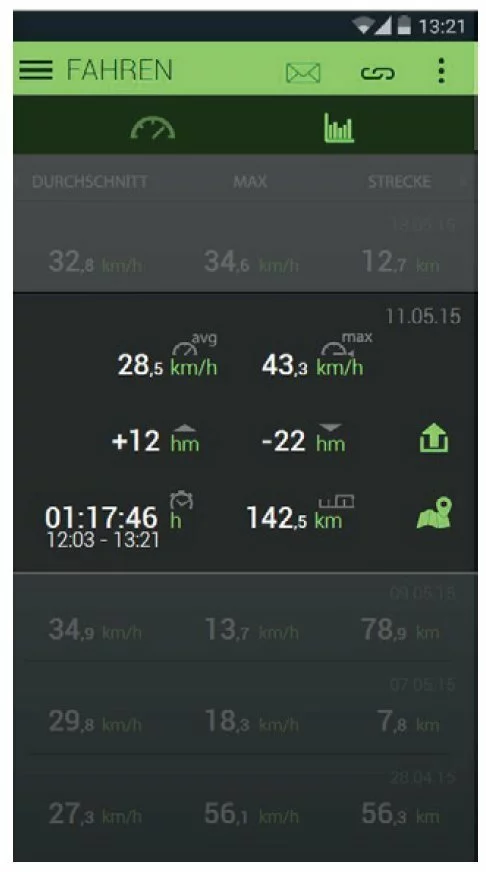 - zusätzlich kann das Smartphone als zweites Anzeigengerät benutzt werden, wenn es am Lenker befestigt wird. Somit lassen sich Tageskilometer, Durchschnittsgeschwindigkeit etc. anzeigen