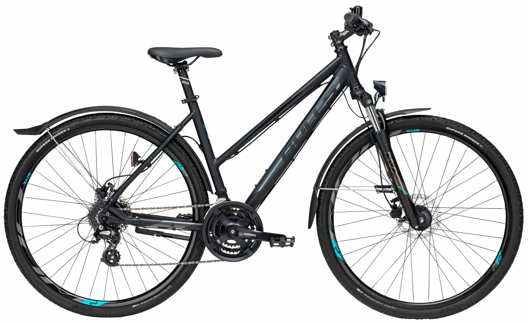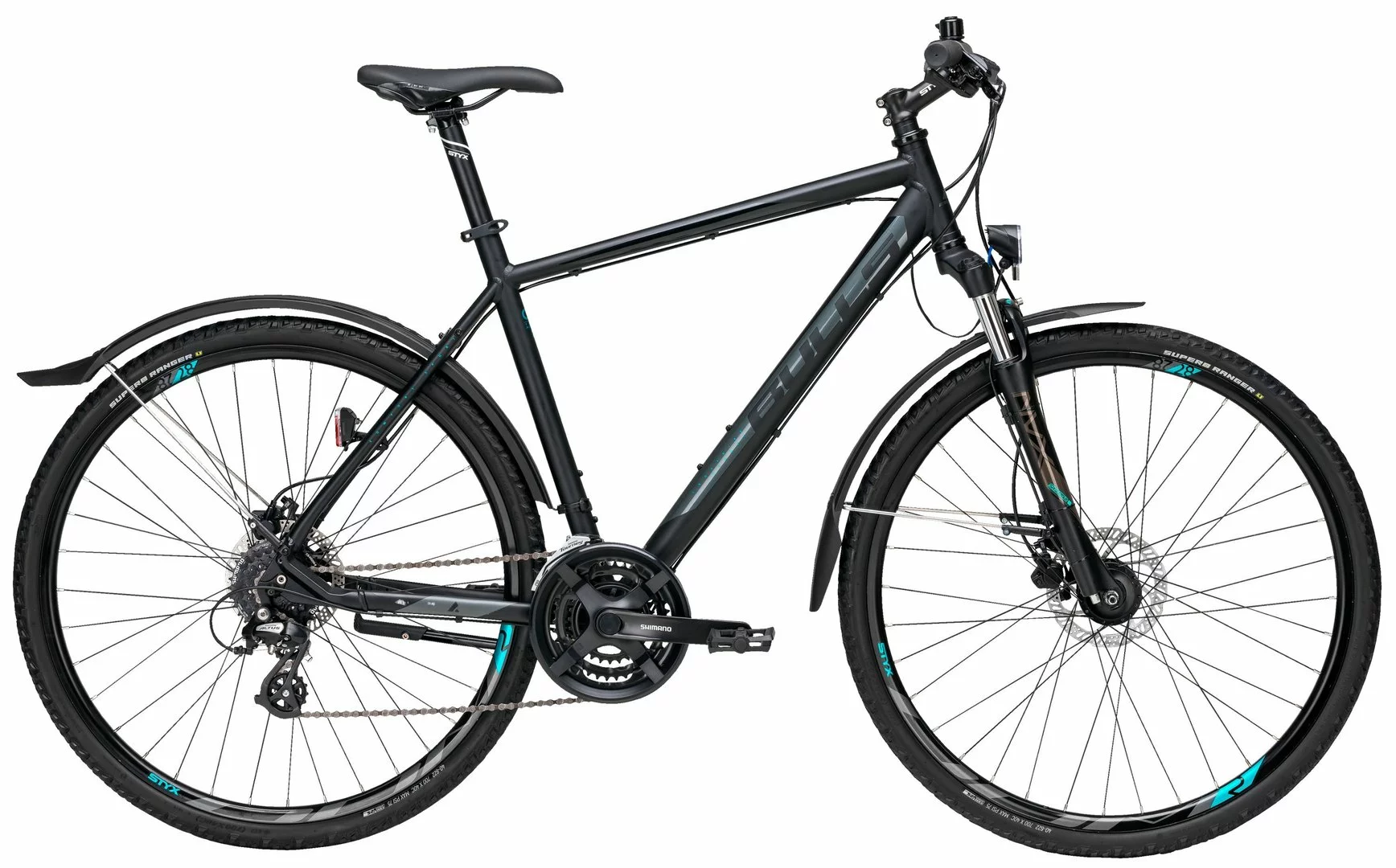 7005 Alu Rahmen, Suntour NVX-DS Federgabel einstellbar, 24-Gang Shimano Altus Schaltwerk und Schalthebel, Tourney Umwerfer und Kurbeln, Tektro HD-M275 hydr. Disc-Bremsen, DDM-2 Hohlkammer-Felgen, STYX Downhill-Lenker, A-Head Vorbau und Sattelstütze, Nabendynamo, 15 Lux LED-Lampe, Standrücklicht hinten auf dem Schutzblech