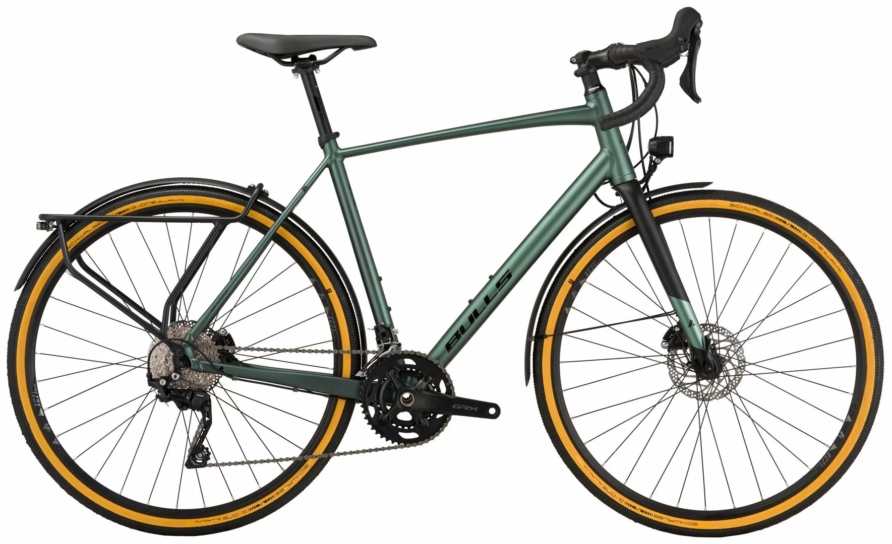 6061 Alu d.b. Rahmen mit tapered Steuerrohr, Carbon Aero-Gabel, Shimano GRX-400 20-Gang Compact Schaltung mit hydr. Scheibenbremsen, GRX-600 Kurbeln 30-46 mit Hollowtech-II Innenlager, 11-36 Zahnkranz, Schwalbe G-One Allround Reifen (40-622), XC-21 Disc Felgen, KT Nabendynamo, Bumm Lumotec IQ-XS Lampe, RL-Mini Rücklicht, Oversized Lenker, Cork Lenkerband