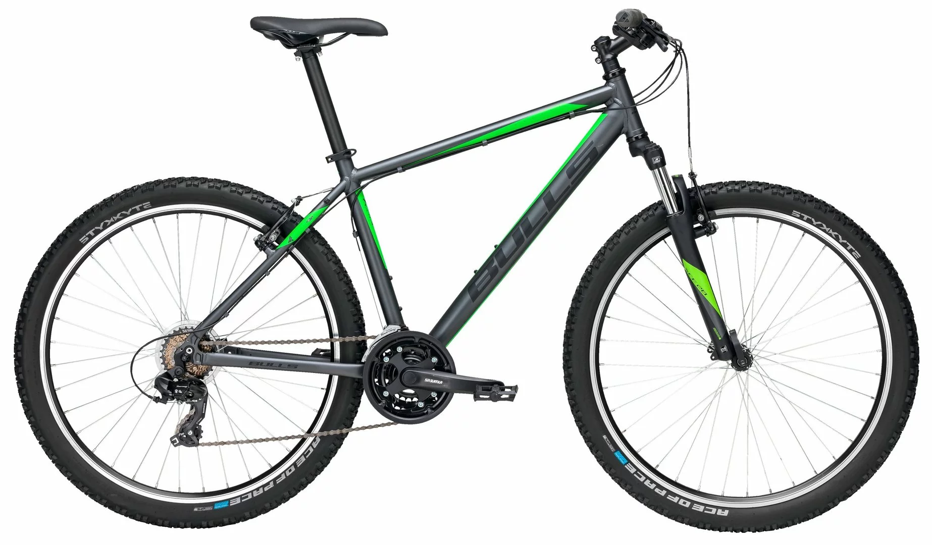 7005 Alu Rahmen, Suntour XCE-28-P Federgabel, 21-Gang Tourney TY300 Schaltwerk, EF-41 Schalthebel, Tourney Umwerfer, Suntour XCC Kurbeln, Formula Naben, Tektro V-Bremsen, STYX Alu Felgen, Alu Downhill-Lenker, A-Head Vorbau, 2-Bolt Sattelstütze, Bulls Sattel, STYX Ace of Pace Reifen 27½x2,25 Zoll