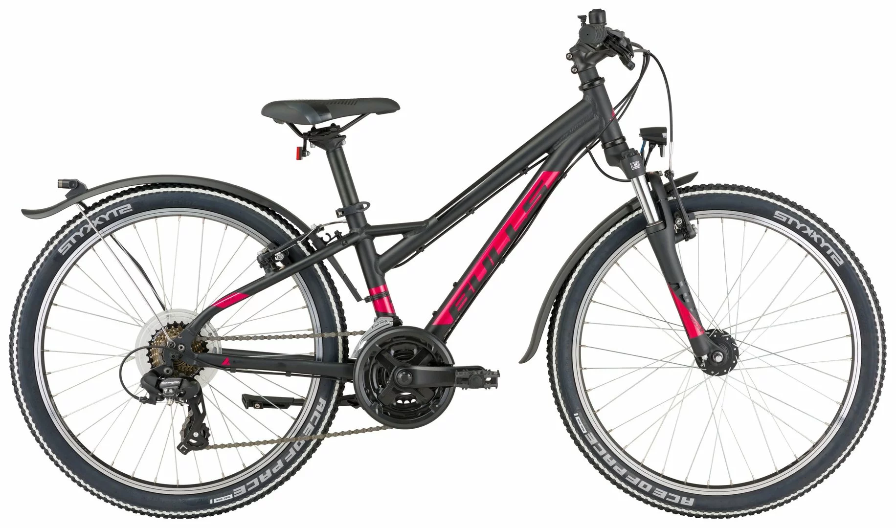 6061 Alu-Rahmen, Suntour XCT-JR Federgabel, 21-Gang Shimano Tourney Schaltwerk und Umwerfer, EZ-Fire Schalthebel, Alu Kurbeln, Alu HR-Nabe, Alu Felgen, Tektro V-Bremsen, Downhill-Lenker, Steckbleche, Nabendynamo, 30 Lux LED-Lampe, Standrücklicht, Ständer