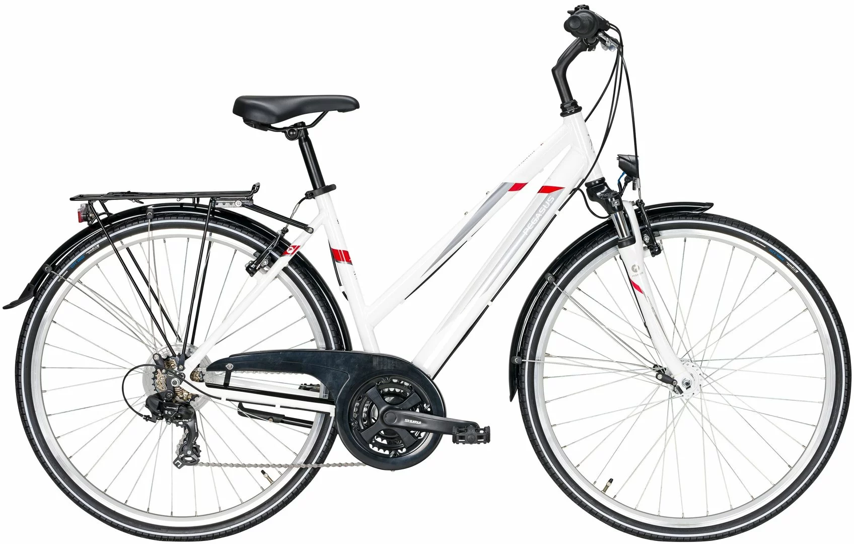 Alu Rahmen, Suntour CR-100 Federgabel, Shimano Tourney 18-Gang Schaltwerk, Umwerfer und Revoshift Schalthebel (Drehgriffe), Suntour Kurbeln mit gekapseltem Lager, Alu V-Bremsen, Hohlkammer-Felgen, Nabendynamo, 30 Lux LED-Lampe, Standrücklicht, Kettenschutz