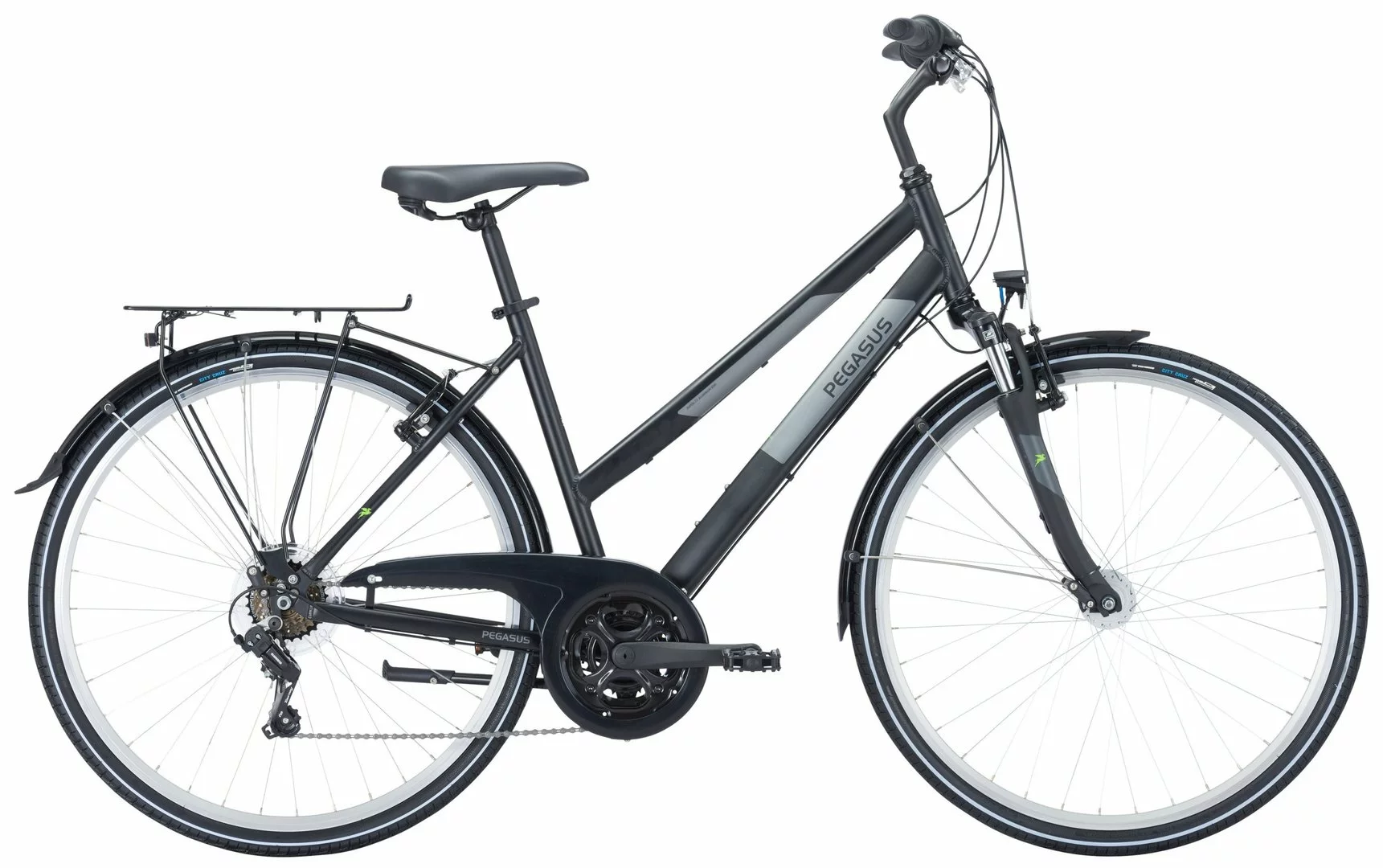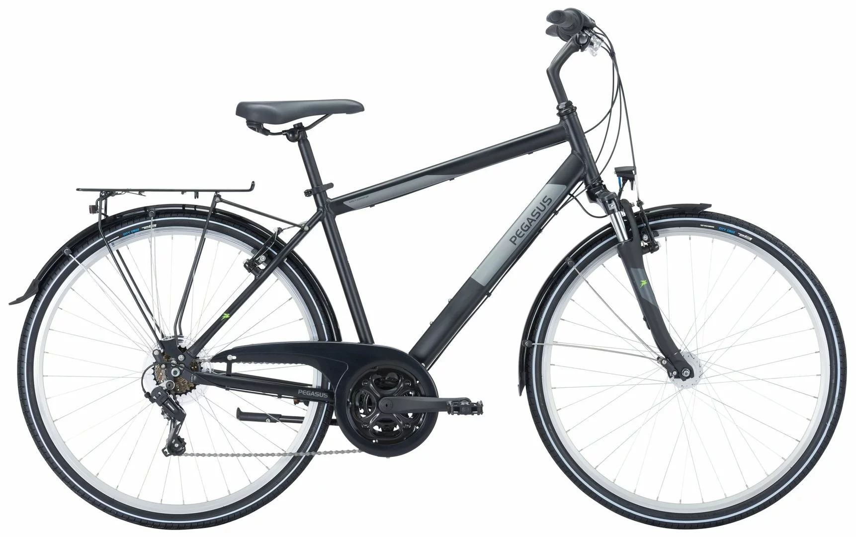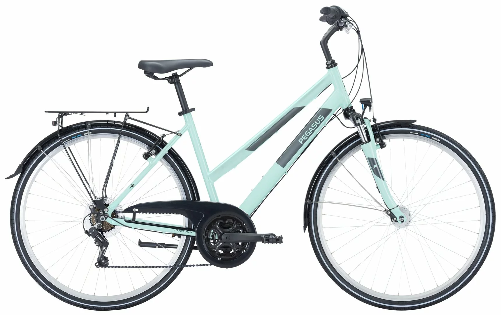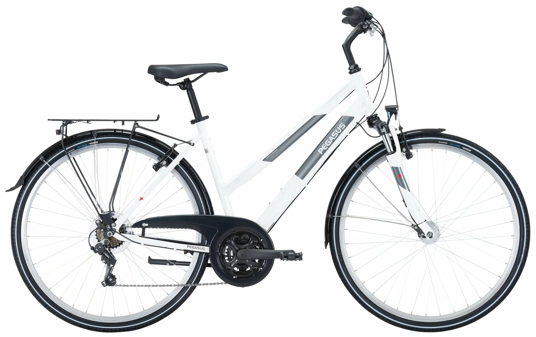 Alu Rahmen, Suntour CR-8V-P Federgabel, Shimano Tourney 18-Gang Schaltwerk, Umwerfer und Revoshift Schalthebel (Drehgriffe), Suntour Kurbeln mit gekapseltem Lager, Alu V-Bremsen, Hohlkammer-Felgen, Nabendynamo, 30 Lux LED-Lampe, Standrücklicht, Kettenschutz
