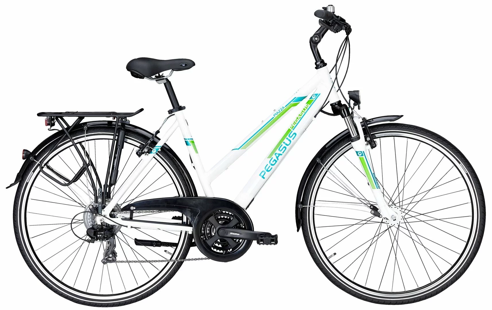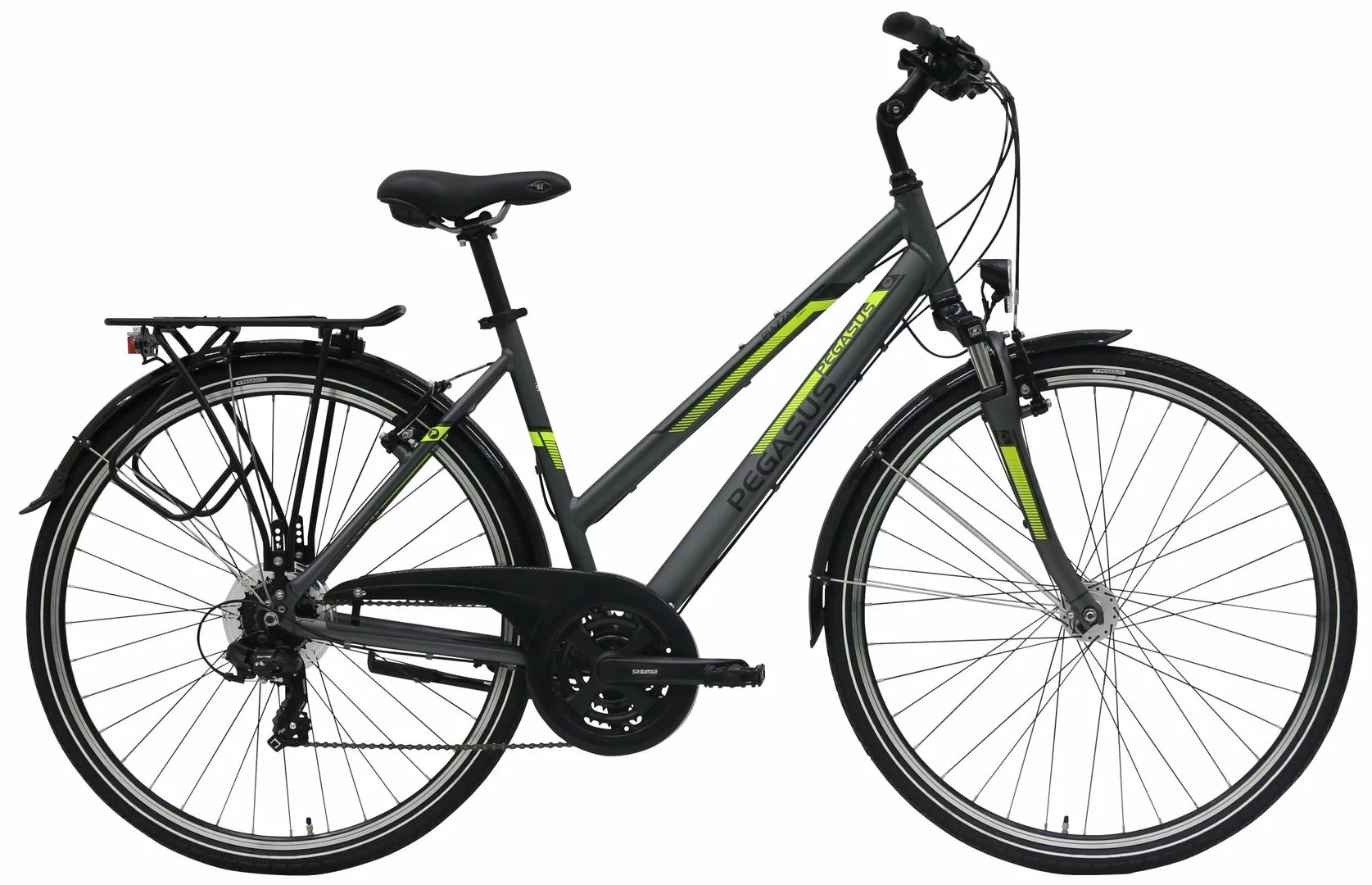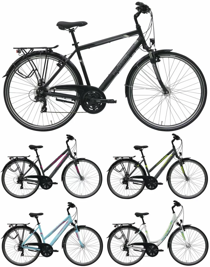 Alu Rahmen, Suntour CR-7V Federgabel, Shimano Tourney 21-Gang Schaltwerk und Umwerfer, Altus EZ-Fire, Suntour Kurbeln mit gekapseltem Lager, Alu V-Bremsen, DBM-1 Hohlkammer-Felgen, verstellbarer Vorbau, Nabendynamo, 15 Lux LED-Lampe, Standrücklicht