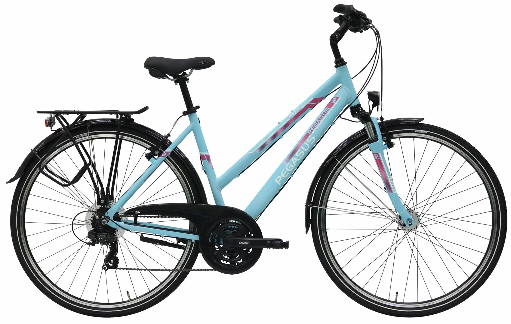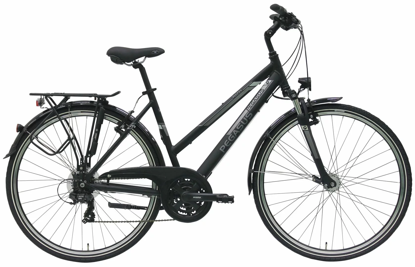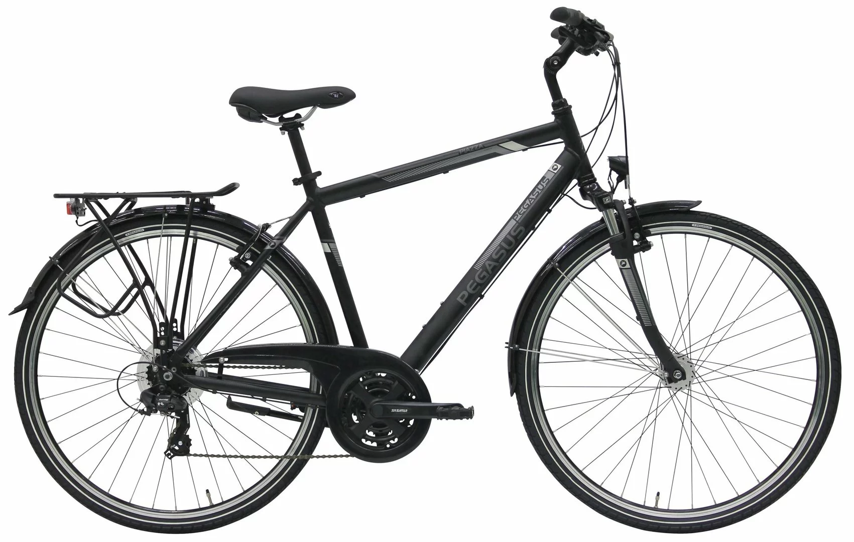 Alu Rahmen, Suntour CR-7V Federgabel, Shimano Tourney 21-Gang Schaltwerk und Umwerfer, Altus EZ-Fire, Suntour Kurbeln mit gekapseltem Lager, Alu V-Bremsen, DBM-1 Hohlkammer-Felgen, verstellbarer Vorbau, Nabendynamo, 15 Lux LED-Lampe, Standrücklicht