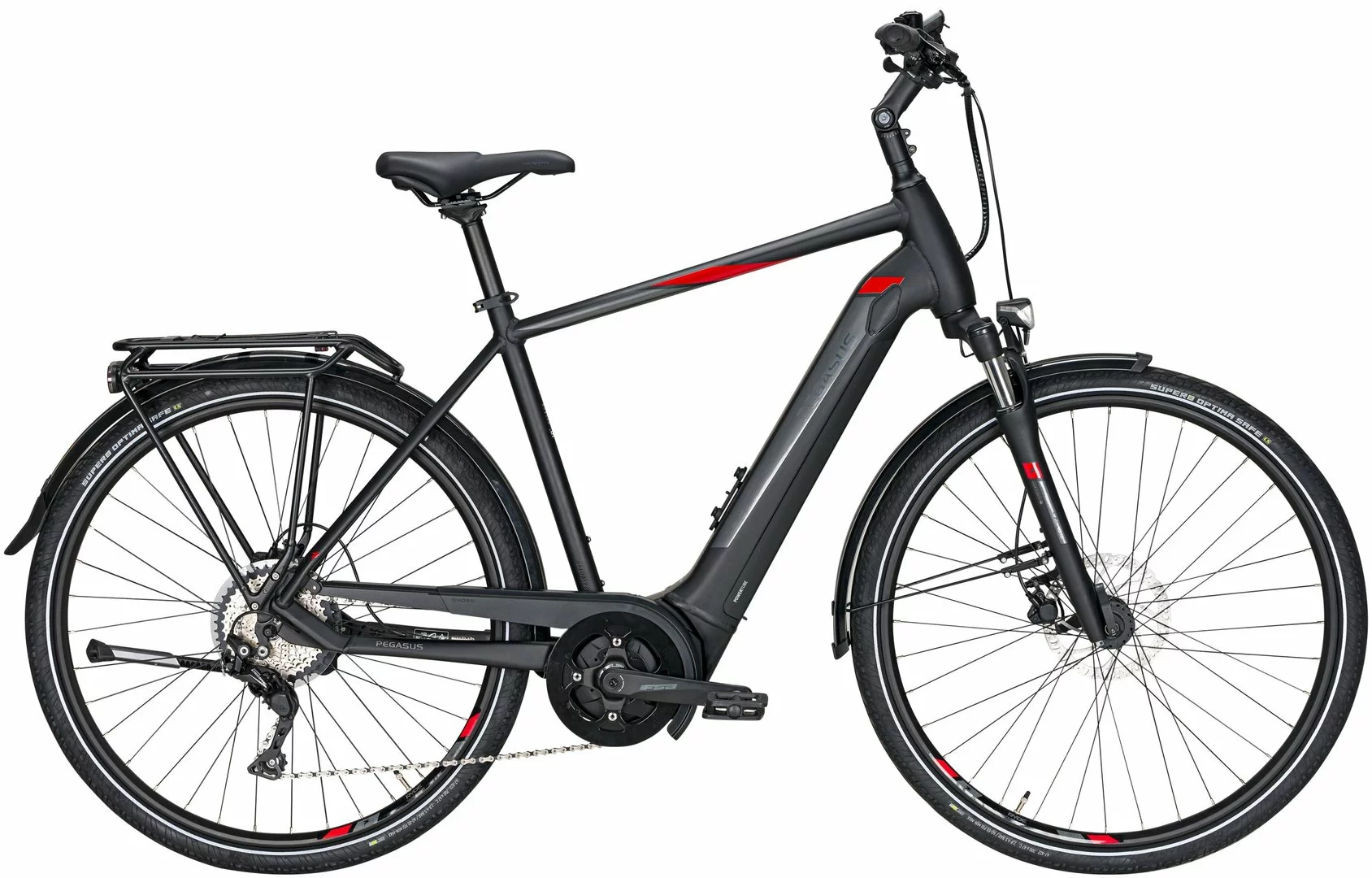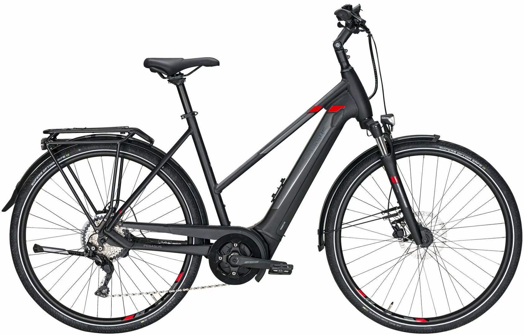 Hydroforming 7005 Alu-Rahmen mit Tapered Steuerrohr, NEX-E25-HLO Federgabel, Deore 10-Gang Schaltwerk, Schalthebel und Zahnkranz (11-42), Tektro HD-M275 Scheibenbremsen mit 160/180mm Bremsscheiben, Taurus-2000 Hohlkammerfelgen, Bosch Performance-Line Mittelmotor 250W/63Nm, integrierter 400Wh (Serie), 500Wh oder 625Wh (Aufpreis) Akku 36V Li-Ion, Supero Optima Safe Reifen 47-622, Fuxon F-170 LED-Lampe mit 70 Lux, 12 Volt Lichtanlage, Comodoro Sattel, verstellbarer UP-Vorbau