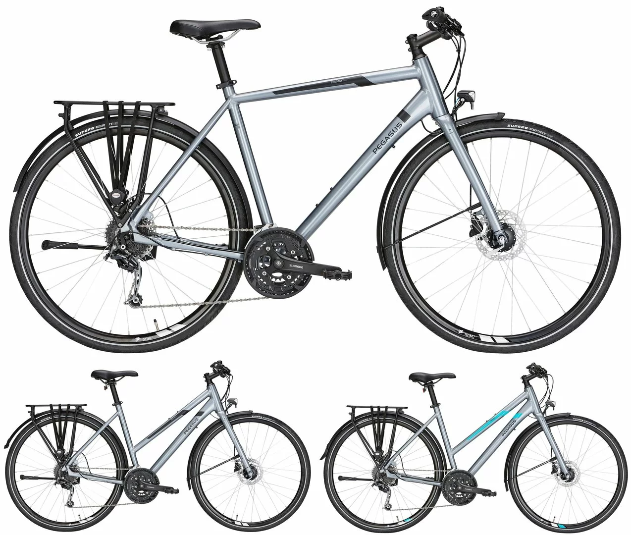 7005 Alu-Rahmen double butted mit innenverlegten Kabeln, Carbon Starrgabel, Deore Schaltwerk, Alivio Schalthebel und Umwerfer, Acera Kurbeln (26-36-48 Zähne) und Zahnkranz (11-34 Zähne), Formula HR-Nabe, M315 Scheibenbremsen, DDM-2 Disc Hohlkammer-Felgen, SKS Schutzbleche, Fix-System Griffe, Nabendynamo, 60 Lux LED-Lampe, Bumm Toplight small Rücklicht, Supero Esprit Reifen 40-622