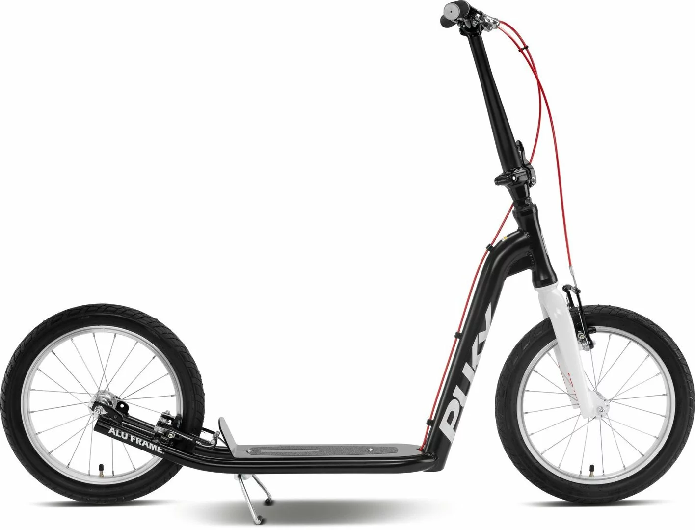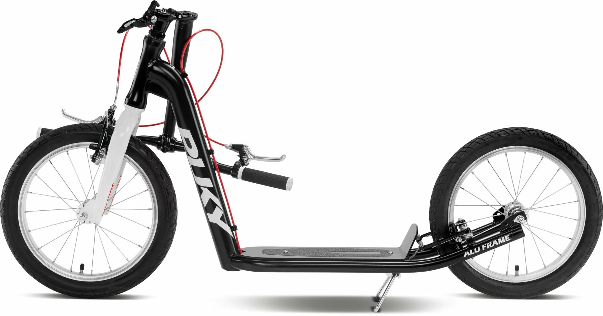 Wer flott und stylisch unterwegs sein möchte, kommt an PUKY JOKER nicht vorbei. Ob für einen kurzen Trip durch die Wohnsiedlung oder der Pendelweg zur Arbeit. Mit seinen 16″ Alu-Laufrädern liegt der PUKY JOKER gut auf der Straße und überwindet kleine Hindernisse spielend leicht. Für langanhaltende Laufruhe sorgen zudem die kugelgelagerten Speichenräder und die Lenkung. Für massig Grip hat Puky dem Scooter Dual-Density-Griffe sowie ein rutschfestes Trittbrett verpasst. Die griffigen V-Brakes vorne und hinten bringen den PUKY JOKER schnell zum stehen. Wie alle Puky-Modelle hat der Alu-Scooter eine stoßfeste Pulverbeschichtung vorzuweisen. Der PUKY JOKER wiegt dank leichtem Alurahmen nur 7,7 kg und kann durch den Klapp-Vorbau verkleinert werden. Damit Jung und Alt Spaß am cleveren Scooter haben, lässt sich der Lenker des PUKY JOKER in der Höhe verstellen.