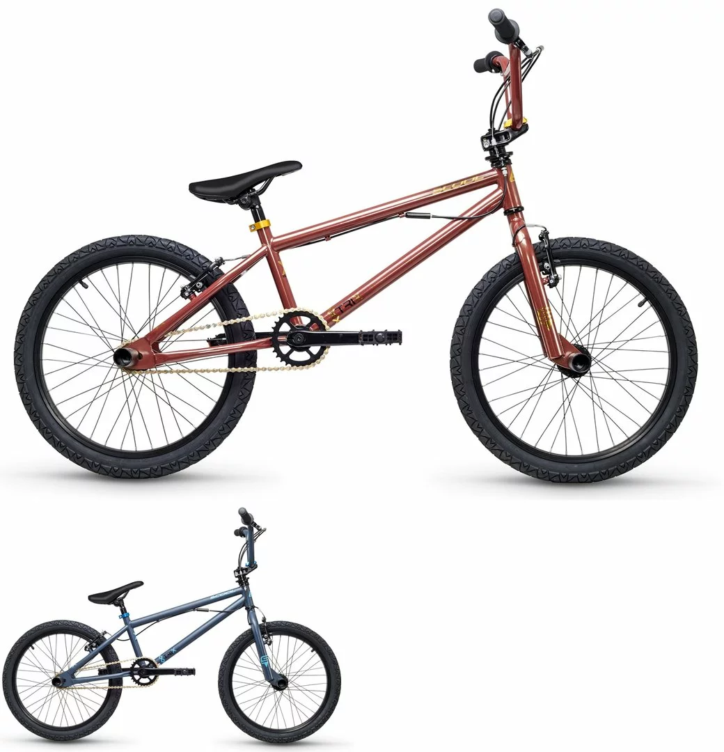 HiTen Rahmen, Gabel 1 1/8 HiTen A-Head, Bremsen Mini V-Brake vorne und hinten mit Rotor für hinten, Kurbel 3-teilig 30 Zähne 170mm, neigungsverstellbarer Sattel, Axles Pegs vorne und hinten, Toploader Alu A-Head Vorbau